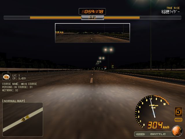 コース上には、他の参加者の車の他、「ライバル」と呼ばれるNPC(NonPlayerCar=コンピューターが操縦している)も周回しており、後ろから追いついてパッシングすることで、いつでも自由にバトルを開始できます。バトルの形式は、格闘ゲームに近く、相手よりも前に出ると、相手のSP(精神力)が徐々に減っていき、0にすれば勝ちとなります。引き離せば離すほど早くSPが減りますし、逆に抜かれれば自分のSPが減り始めます。バトルが終われば元通り、次のバトルでは再びSP満タンからになります。バトルに勝つと、相手が他の参加者(PlayerCar)の場合はEXP(経験値)が、NPCの場合はCP(クレジットポイント)やボーナスを得ることができます(負けてもCPを少しだけもらえます)。経験値がたまるとランキングが上昇し、CPがたまればチューニングパーツや新しい車が買えるようになります。NPCのボーナスには、瞬間パワーアップアイテムや、チューニングパーツ・レア車などと交換できるチケットがあります。