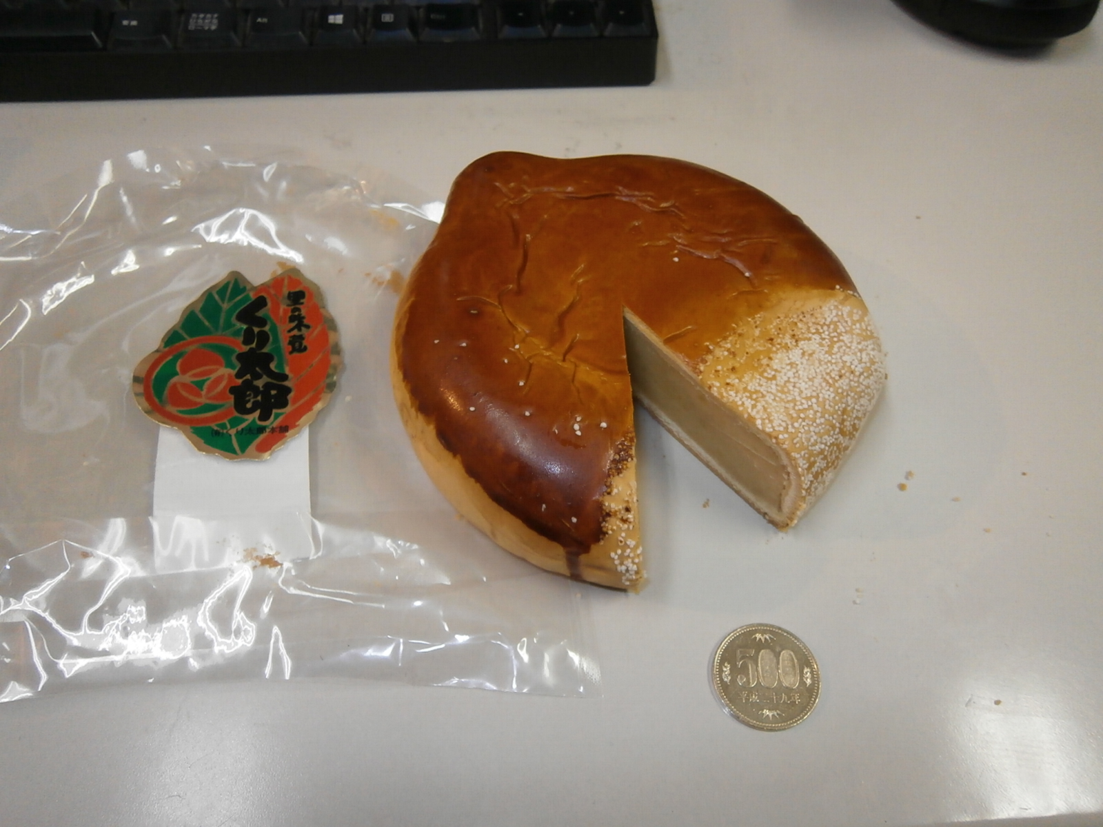 年越し温泉旅行の帰り道で買ったネタ土産のご紹介。 「くり太郎」とか言う特大栗饅頭です。 栗饅頭好きとしては見た瞬間目が離せなくなり買ってしまいました。 味は普通の栗饅頭で一安心。相応に皮も厚いのでバランスも悪くない。 まあ普通の栗饅頭買った方が安上がりだとは思いますが。 高速のサービスエリアで買ったので、それほど珍しいものでもなさそうだし。